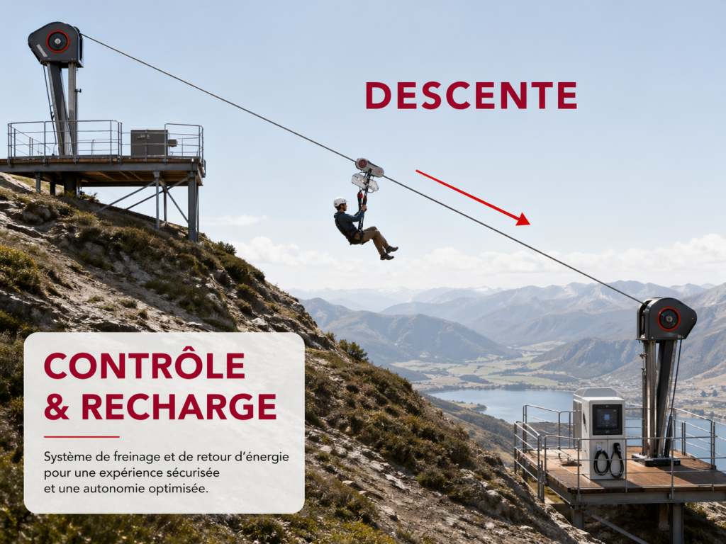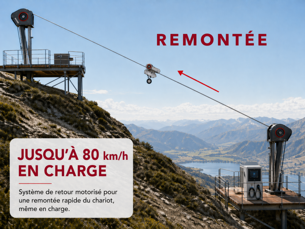 Nos chariots de tyrolienne (« Zipline » en anglais)  allient toutes ces technologies afin d’accomplir leur tâche : transporter des charges de façon automatisée, pilotable et contrôlée.